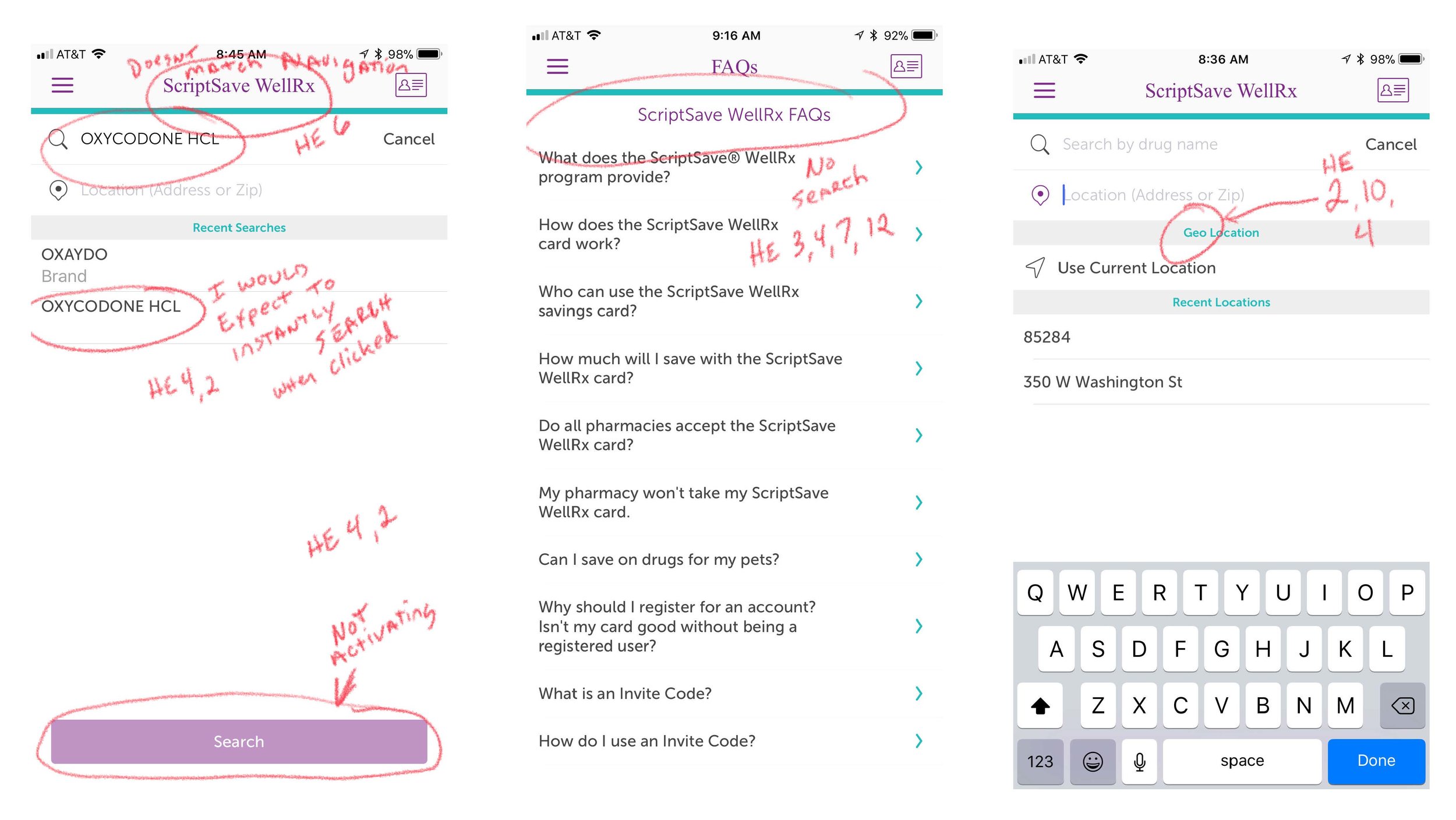 User research and interviews with real users was a challenge with this project due to concerns about HIPPA compliance and ScriptSave’s dedication to keeping its user’s health information safe and secure. Several elaboration session and interviews where done with the business subject matter experts. I also supplemented research by reaching out to multiple members of the community to and medical professionals to identify users who where willing to share their experience using prescription savings card and applications.